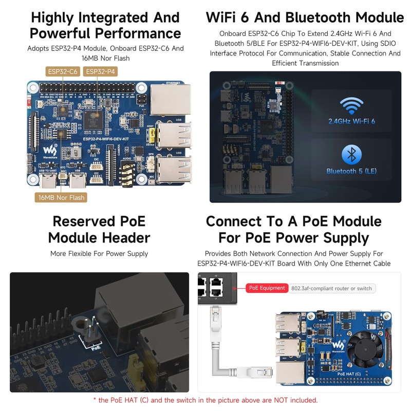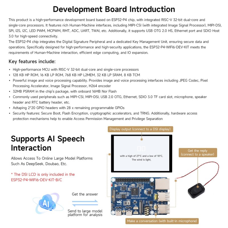 Waveshare ESP32-P4-WIFI6-DEV-KIT High-Performance Development Board, Based on ESP32-P4 & ESP32-C6, Supports Wi-Fi 6, Bluetooth 5 & BLE 5, Bundle with Board and Speaker