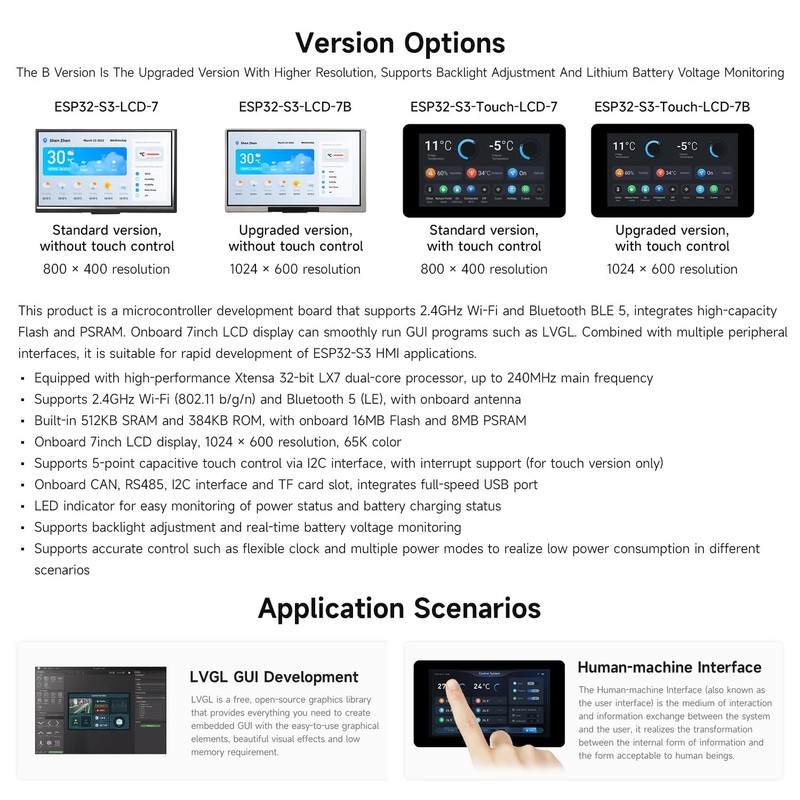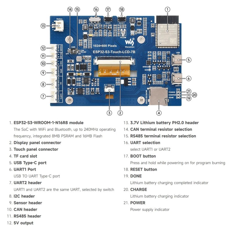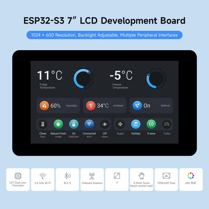 Waveshare ESP32-S3 Display 7 Inch LCD Development Board, 1024 x 600 Resolution, 32-bit LX7 Dual-Core Processor 240MHz, Wi-Fi & Bluetooth Support, Onboard Antenna, with Touch