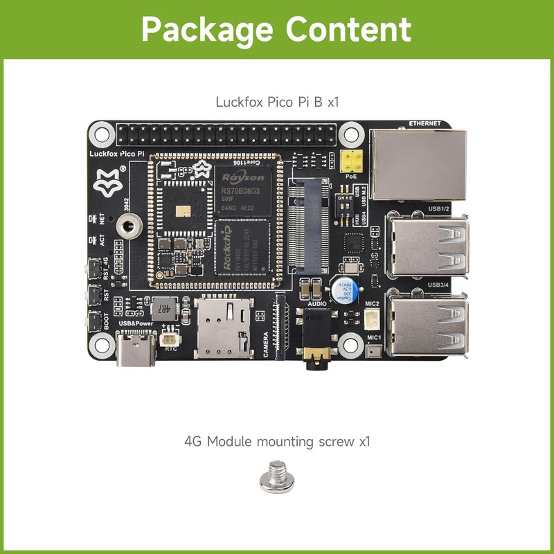 - Versatile Interface Support: Supports multiple interfaces including MIPI CSI, GPIO, UART, SPI, I2C, USB, and an M.2 slot for 4G module, making it suitable for a wide range of embedded and IoT applications.