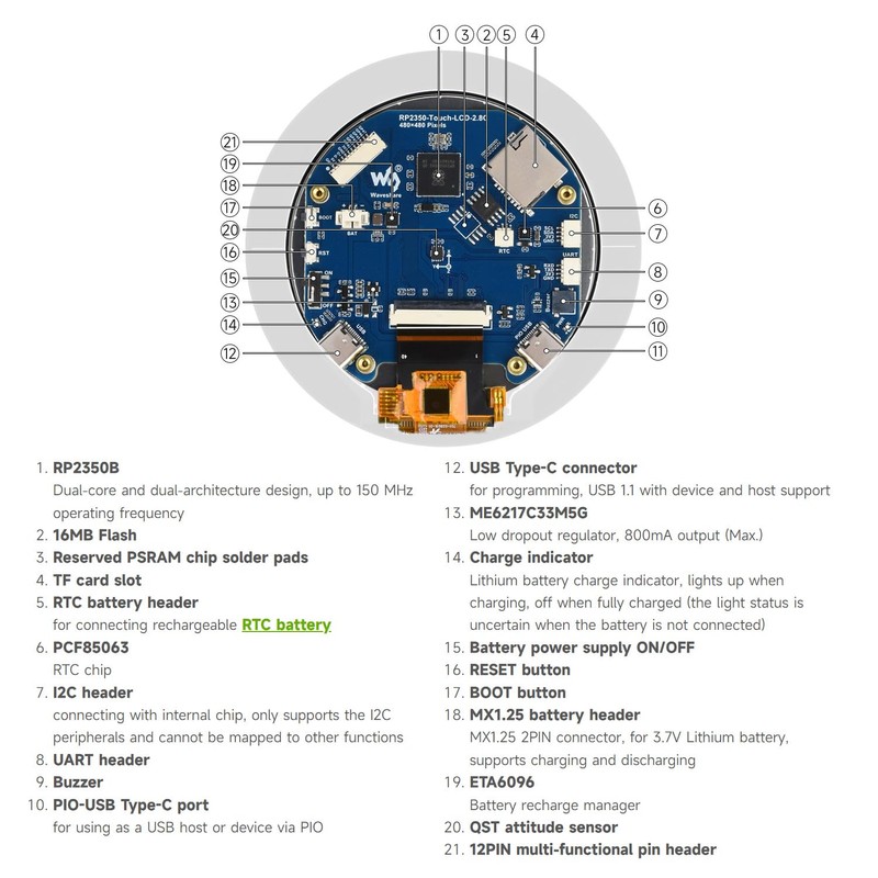 Waveshare RP2350 2.8inch Round Display Development Board, 480×480, Based On The Raspberry Pi RP2350B Dual-core & Dual-Architecture Microcontroller, RGB Interface