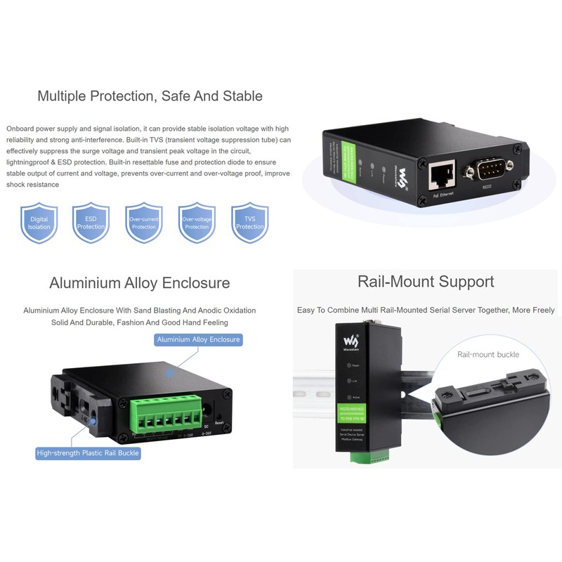 Waveshare RS232/485/422 to Ethernet Converter, Industrial Isolated Rail-Mount Serial Server with POE Function, Modbus Gateway Support, Multi Communication Modes