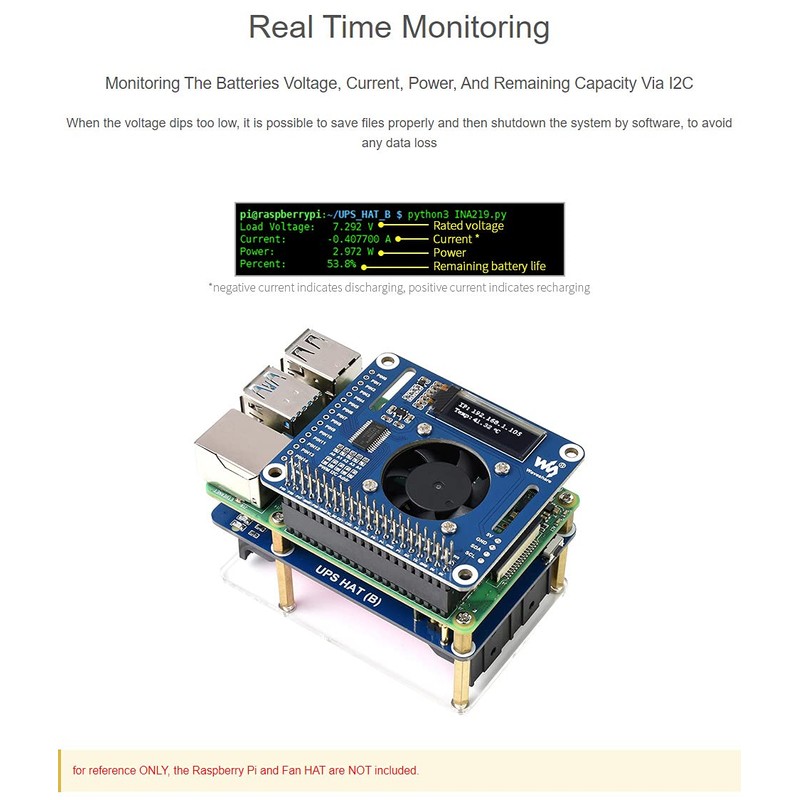 • Designed for Raspberry Pi series, compatible with Raspberry Pi 3 / 3B+ / 4B, etc. I2C bus communication, monitoring the batteries voltage, current, power, and remaining capacity in real time