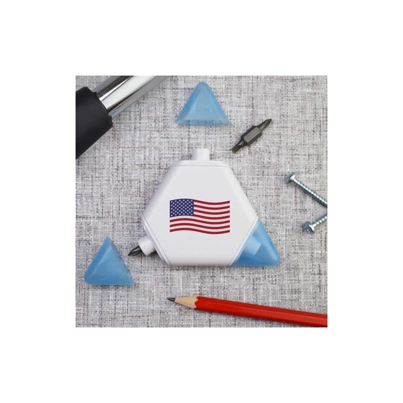 Our triangular compact multi tool is printed on one side with a unique design, making it a great gift for DIY lovers. This 3-in-1 tool set contains a tape measure and 2 different screwdriver attachments and each corner has a snap shut lid. One corner reveals a 1 meter tape measure, while the others hide two reversible screwdriver attachments, one larger and one smaller, both of which have a cross head on one end and a flat head on the other.