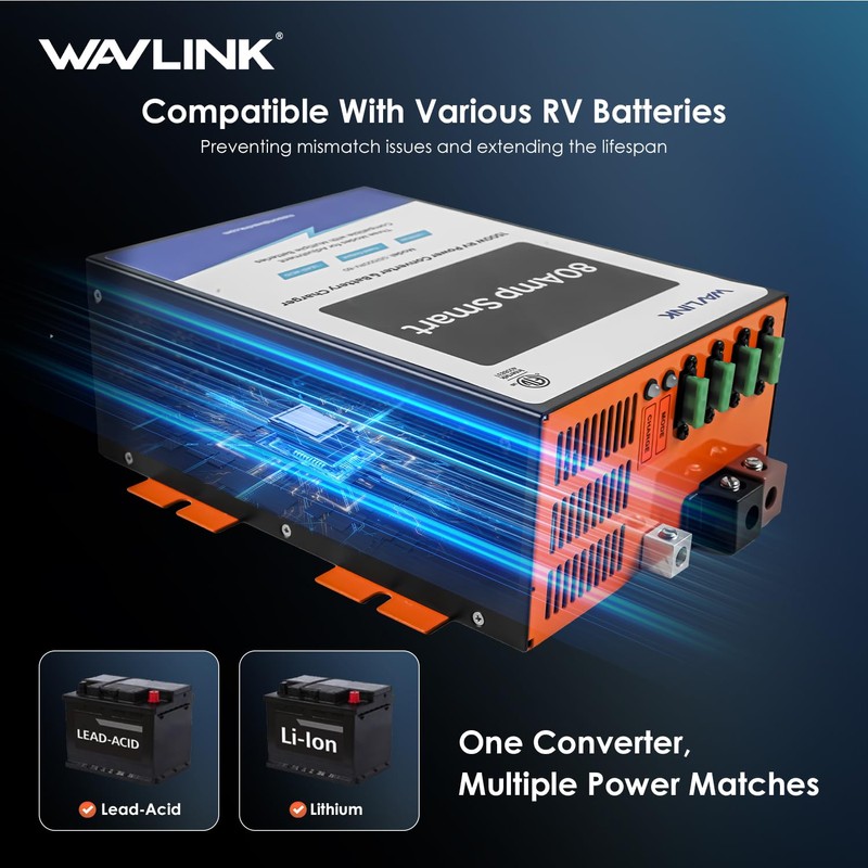 WAVLINK RV Power Converter 80 Amp, 120V AC to 12V DC, Smart Lithium Battery Mode, Lead-Acid Battery Mode & Fixed Voltage Mode, Adjustable 13V-16.5V Voltage Compatible with Various RV Batteries