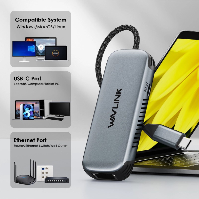 WAVLINK USB C Gigabit Ethernet LAN RJ45 5Gbps Network Adapter 95W Charging Driver-free