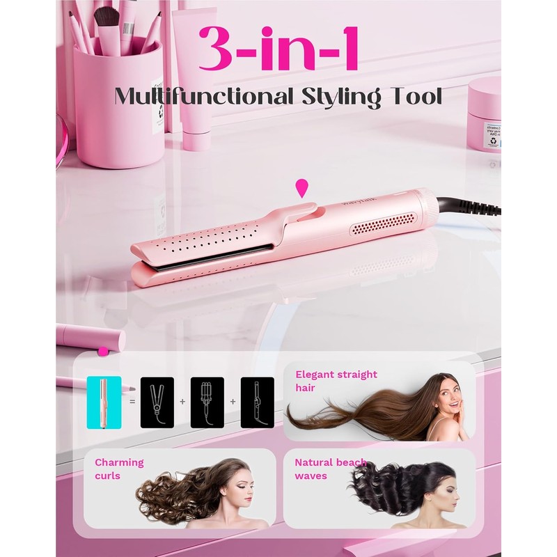 Wavytalk 1 Inch Curling Iron, Airflow Styler with 360° Cooling Air to Lock in Curls Quicker, Hair Straightener and Curler 2 in 1, Pink, 30S Heating