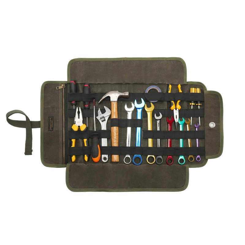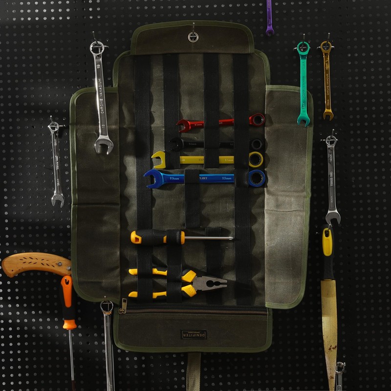 - Design: elastic loops for holding SAE/metric wrench sets, Allen keys, key sleeves, ratchets, pliers, adjustable wrenches and other hand tools. 1 smooth zip pocket for storing tools such as chisel rollers, hammer, pliers, ruler, scissors, pencils, tape measure, magnetic level, screwdriver, safety glasses, gloves, etc.