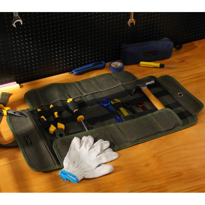 Waxed Canvas Tool Rollers with Canvas Strap Closure, Tool Bag with Elastic Strap, 1 Pocket with Zipper Pockets (Army Green)