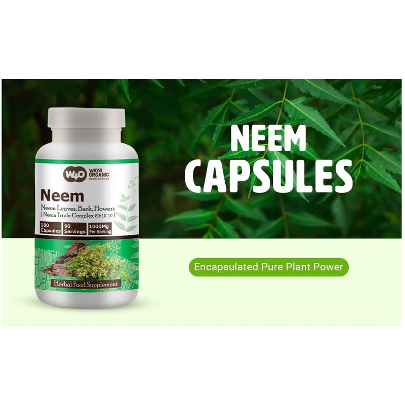 WAY 4 ORGANIC W4O Neem Triple Complex - High-Potency Azadirachta Indica Capsules, Neem Leaves, Bark, Flowers in Ratio (80:10:10) - 180 Capsules, 90 Serving, 1000 Mg per serving. Pack of 2.