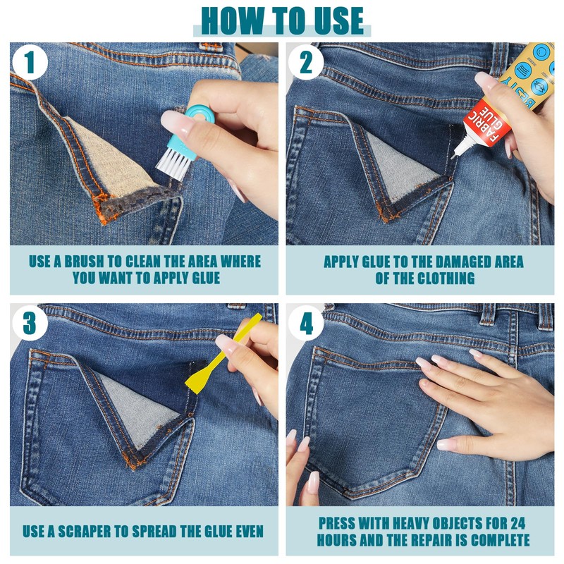 - Easy to Use: Our fabric glue for patches is liquid stitch design, which comes with a glue applicator and clip. You just need to apply the clothing glue to the joint, use our glue applicator to evenly distribute the fabric fusion glue , and fix the joint with the provided clip. Then wait for 24 hours, and you will be done