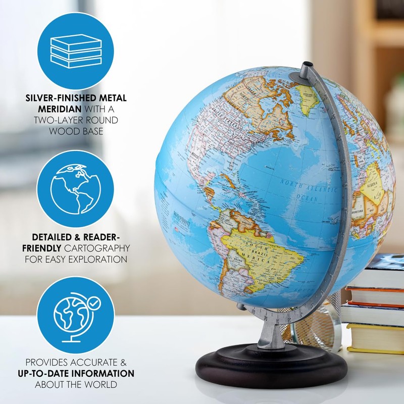 • Up-to-Date Globe: The globe boasts up-to-date cartography with thousands of named places. The vibrant colors and clear, easy-to-read font of the globe enable easy identification of different places of the world to learn about their unique features.