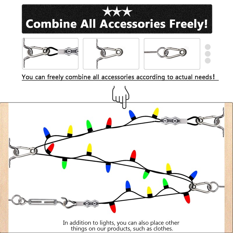 - 【Wide Application】-Our guide wire for string lights can be used in multiple ways such as suitable for patio string light kit, string light pole, photo frames, clothes, shade sails. You can shape different lighting suspension types to enhance the visual effect according to different of occasion, indoor or outdoor. Using your imagination, Decoration, create Atmosphere and enjoy the fun of DIY.