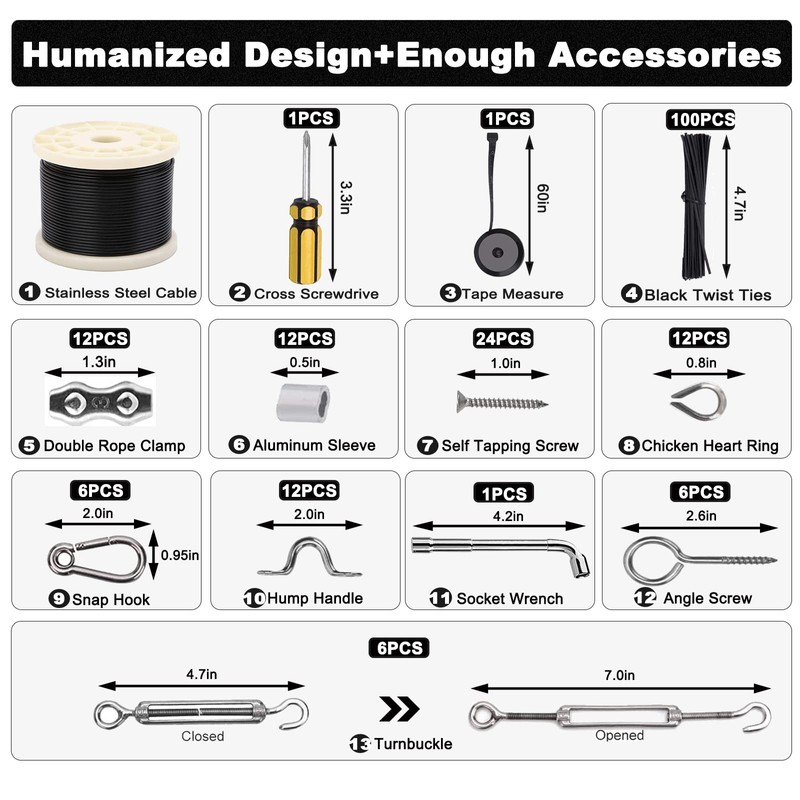 - 【High Quality Material】-The string light wire cable hanging kit is made of US ASTM standard 304 stainless steel, 7 x 7 strands construction, bare OD is 1/16",coated OD is 3/32". The Coated Stainless Steel Cable is Insulated and waterproof, rust-resistant and able to bear any bad weather condition like intensive sun exposure and heavy rain. 480lbs breaking strength ensures its outstanding durability and long-lasting secure hold for the string lights without snagging once pulled tightly.