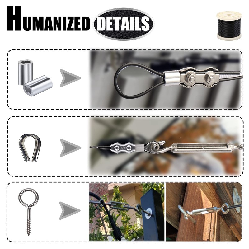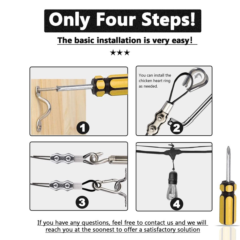 - 【Easy Installation】-It’s sturdy outdoor light guide wire winding around the coil bobbin to prevent tangling. Each part is connected by thread, easy adjust wire rope cable tension using the push-button on snap hook and you can disassemble with your own hands.