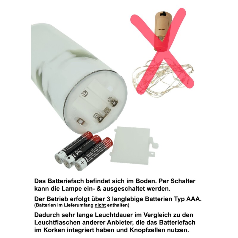 As a decorative item or gift. This lighted bottle looks just gorgeous - even when switched off. The batteries with switch are invisibly integrated into the bottom of the bottle. If necessary, simply turn on the lighting. The light bottle has a very economical connection, so that the standard batteries last a long time.