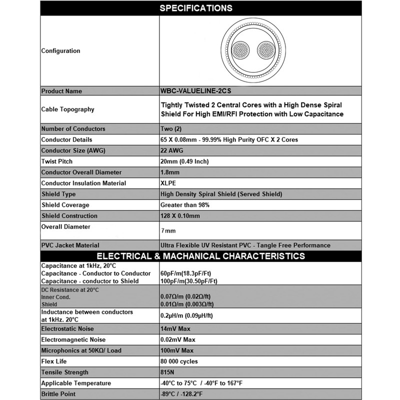 - WBC-VALUELINE-2CS (22 AWG) is a Low-Capacitance, 22AWG Microphone, Active-Speaker & Interconnect cable. Result of years of rigorous R&D, the 2CS boasts a UV-protected jacket, a dense spiral shield, an XLPE sub-shield & two, 22AWG 99.99% Oxygen Free Copper cores made out of 0.08mm Ultra-fine strands. Excellent shielding cancels out all EMI & RFI, this Road-ready cable will encounter, resulting in a pure signal transmission. The Flexible, Tangle-Free jacket makes the cable extremely user-friendly.