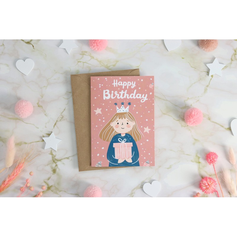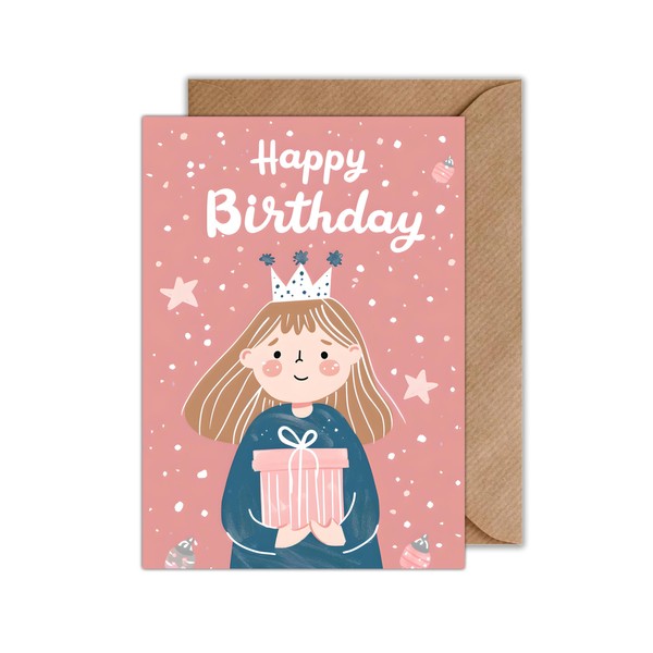 - Fairytale Princess Design The birthday card features an enchanting depiction of a cute princess with a gift in hand, embedded in a soft pink background. This design appeals to the hearts of young girls who dream of fairy tales and princesses.