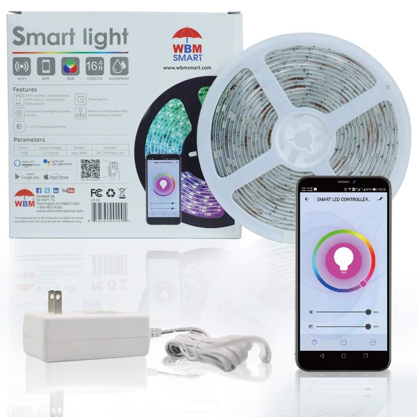 WBM Smart RGB LED Strip Lights, IP65 Waterproof 16.4 ft Long LED Strip, Compatible with Alexa, Google Home, App Control for Home, Kitchen, Bedroom