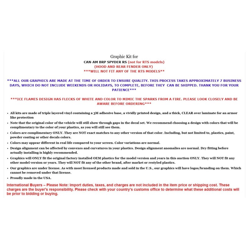 - Graphics will ONLY fit the original factory installed OEM plastics for the model version and years in this auction ONLY. They will NOT fit any other model version or years. They will NOT fit any of the other brand, after market or restyled plastics.