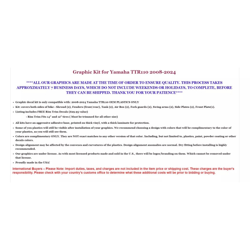 - Graphic decal kit is only compatible with: 2008-2024 Yamaha TTR110 OEM PLASTICS ONLY