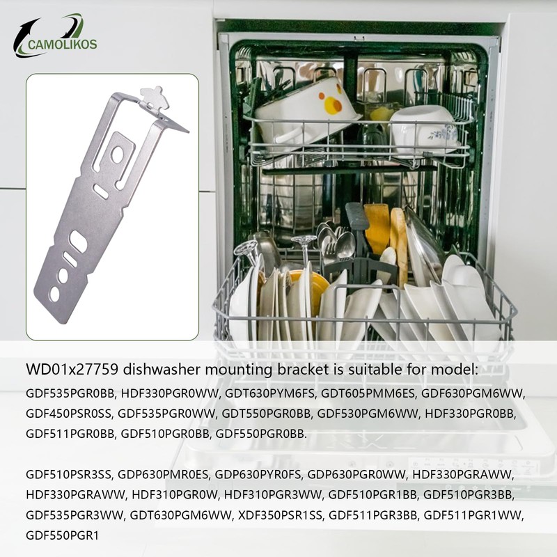 - Features: wd01x27759 mounting bracket is a brand new upgrade to the dishwasher mounting bracket, mainly focusing on the following points: 1. We have thickened the product itself to make it less prone to breakage; 2. Made of high hardness stainless steel material, it has the characteristics of being less prone to rust and wear.