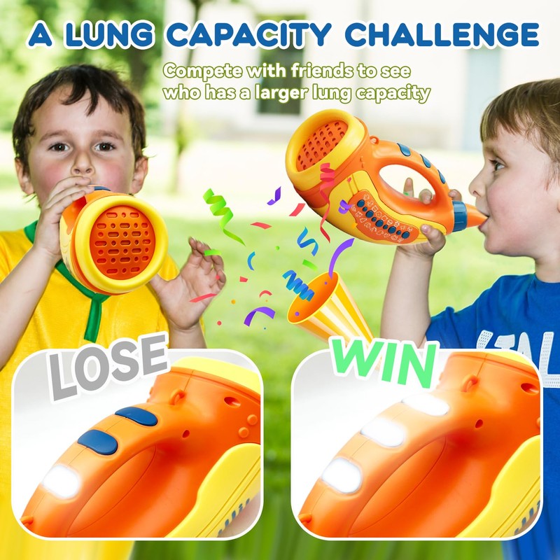 - Boosts Lung Capacity with 3-Level Light Rewards: The longer your child blows, the brighter the lights become! Every 2 seconds, a new level lights up, and after 10 seconds, a cheering sound celebrates their success. This animal sound horn helps improve lung strength while making it fun and interactive0.