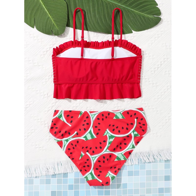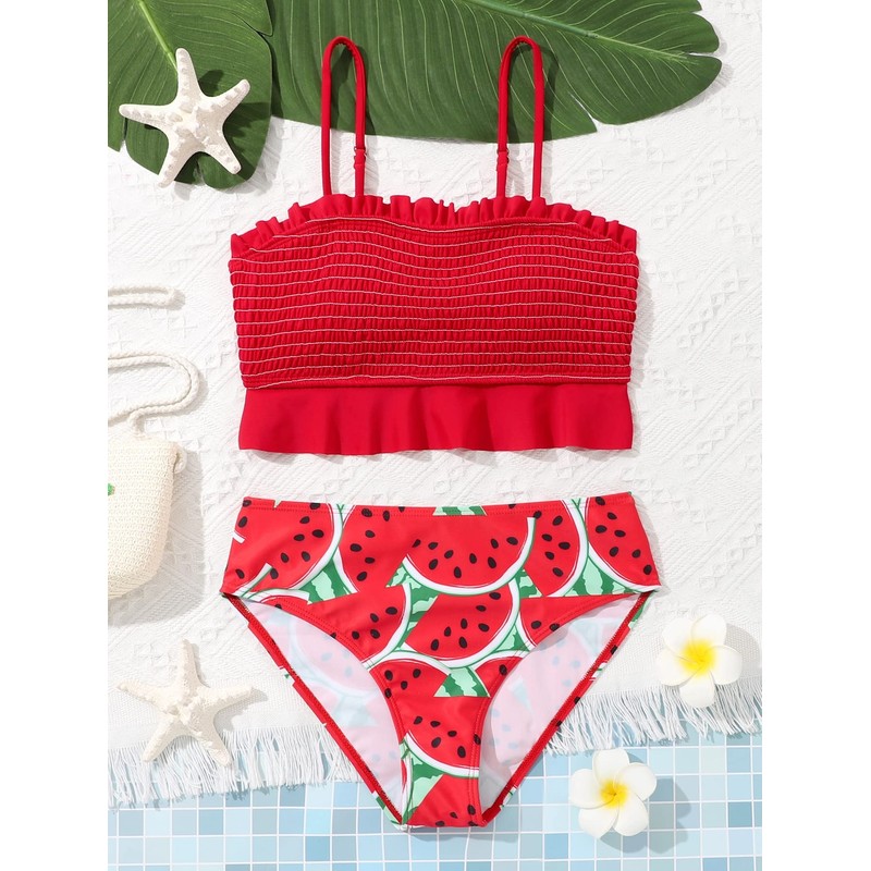 WDIRARA Girl's 2 Piece Set Watermelon Print Swimwear Smocked Ruffle Hem Bikini Set Red 10-11Y