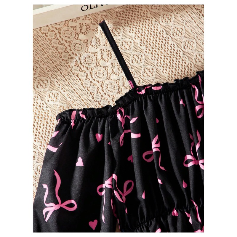 WDIRARA Girl's Butterfly Print Cold Shoulder Blouse Long Flounce Sleeve Peplum Top Black Bow 8Y