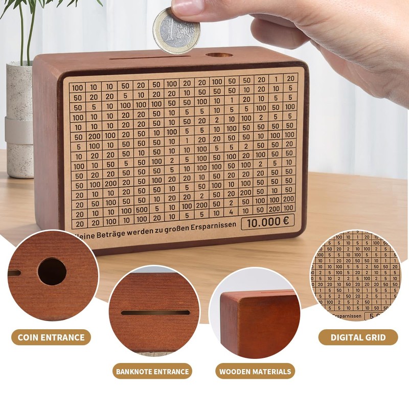 WDJLNZB Wooden Money Box with Saving Target and Numbers for Checking, Money Box with Counter, Retro Money Box Storage Box, for 500 1000 2000 3000 5000 10000 Euro Notes (Brown)