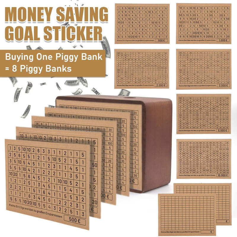 - ✔【8 different target stickers】You will receive 1 wooden money box, 1 marker, 1 tweezers and 8 stickers, including 6 stickers with goals, saving goals 500, 1000, 2000, 3000, 5000, 10000 to choose from, you can set a small goal at the beginning and then slowly set the goal 199999 more to achieve it. We also have 2 blank stickers that you can fill in yourself to set goals.