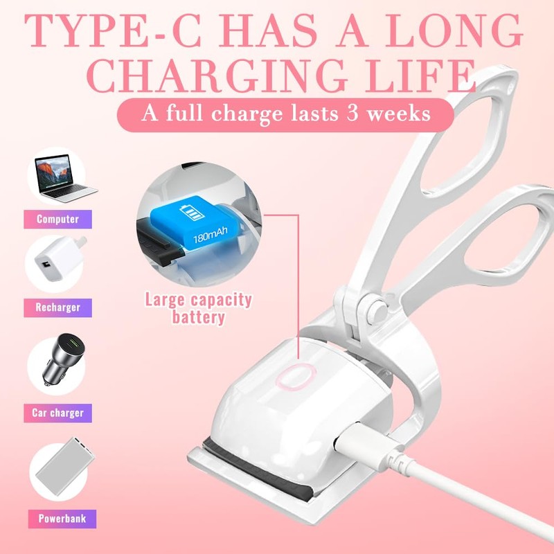 - USB rechargeable eyelash curler: the heated eyelash curler is powered by type C cable. It can be charged via USB, which is more convenient and sensitive. This heated eyelash curler has a large battery capacity and can be used for three weeks after charging and used repeatedly