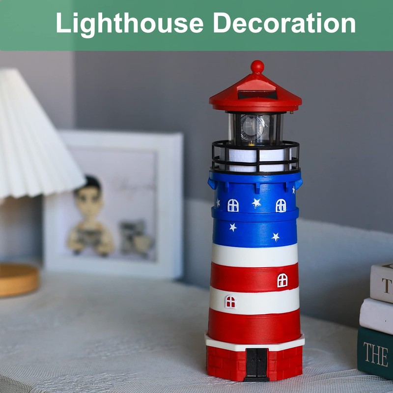WDLFCGC Solar Powered Lighthouse - 12" Tall Solar Lighthouse with Rotating Beacon, 360 Degree Rotating Lighthouse Decoration, Best Lighthouse Gifts for Children(US Flag Red Top)