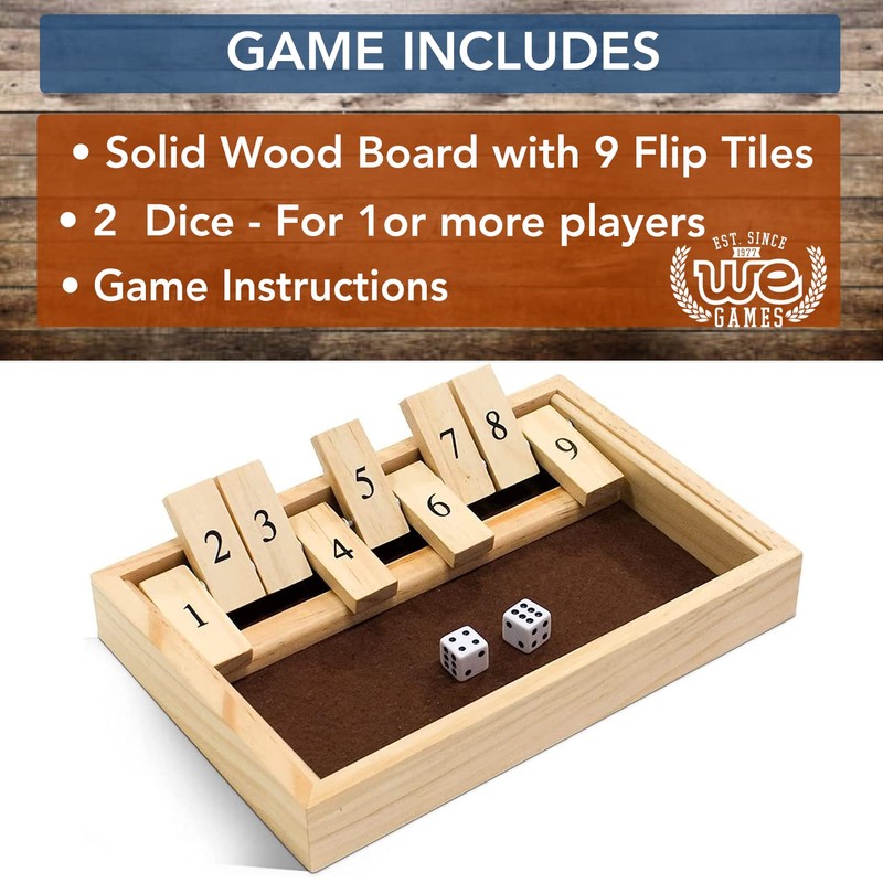 WE Games Classic Dice Board Game – 9 Number Flip Tiles with Natural Wooden Box - 11 inches