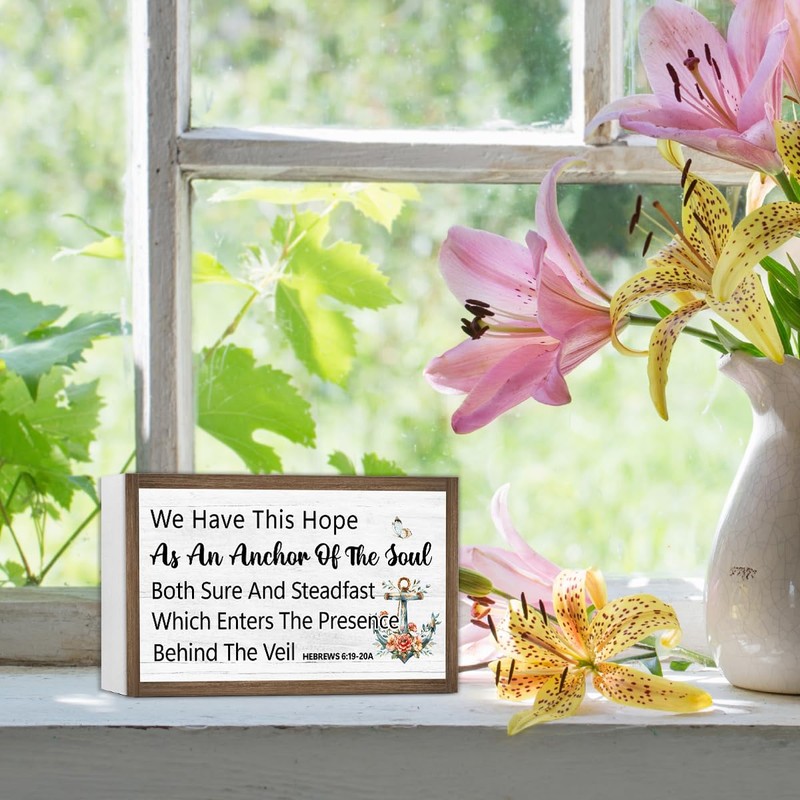 We Have This Hope Hebrews 6:19-20A Bible Verse Wooden Box Sign Desk Decor,Rustic Scripture Wood Block Plaque Sign for Christian Farmhouse Home Office Shelf Tabletop Wall Decor