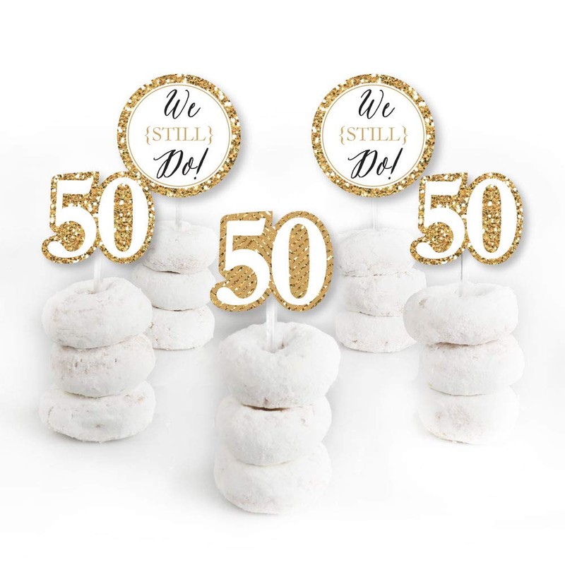- EASY PARTY DECORATIONS: We Still Do - 50th Wedding Anniversary party picks make it easy to style a gold theme party. Create impressive cupcake towers with decorated treats placed on a tiered stand at the candy buffet table, style adorable tables with individual cupcakes at each place setting, or make creative centerpieces using decorated treats and a coordinating treat stand.