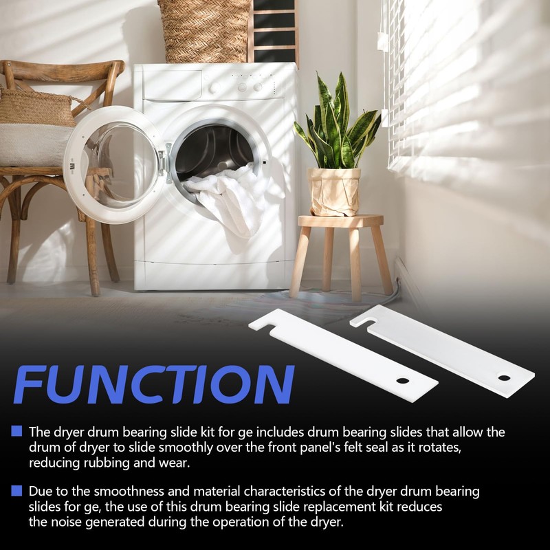 - √ Function of Dryer Drum Bearing Slide Parts: The dryer drum bearing slide kit for ge includes drum bearing slides that allow the drum of dryer to slide smoothly over the front panel's felt seal as it rotates, reducing rubbing and wear.