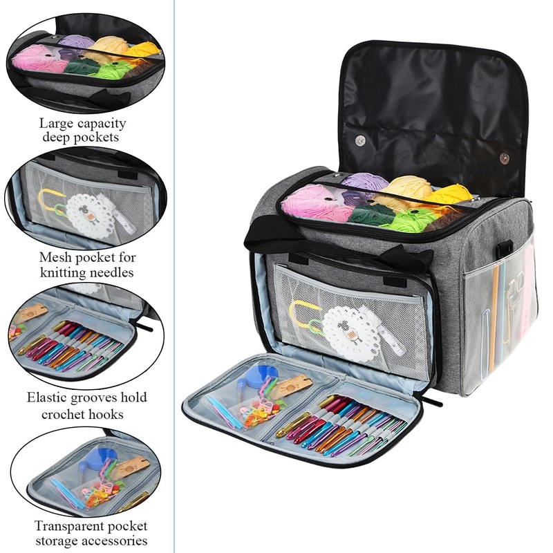 - Larger Capacity Yarn Storage Organizer: Our roomy and huge crochet knitting bag offers multiple interior and exterior storage pockets.Compartments design,Two sides transparent pockets,and elastic bands to hold knitting needles and crochets hooks.knitting organizer bag is large enough for all your hooks,knitting looms,yarn holder,roound needles and yarn.Store your unfinished projects,keeping everything neatly organized.