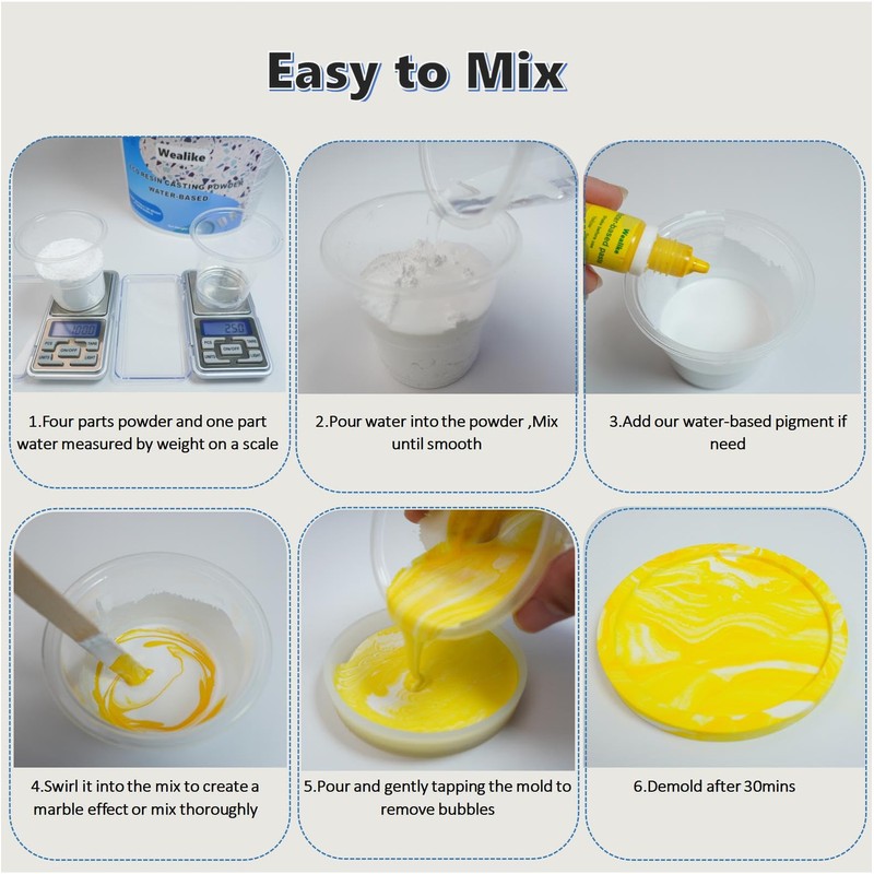 - ✅The Wealike plaster casting powder kit including 6.6lbs/3000g casting powder, 6xpigment pasters, 1xspoon,2xcups,4 wooden sticks,1x instructions.