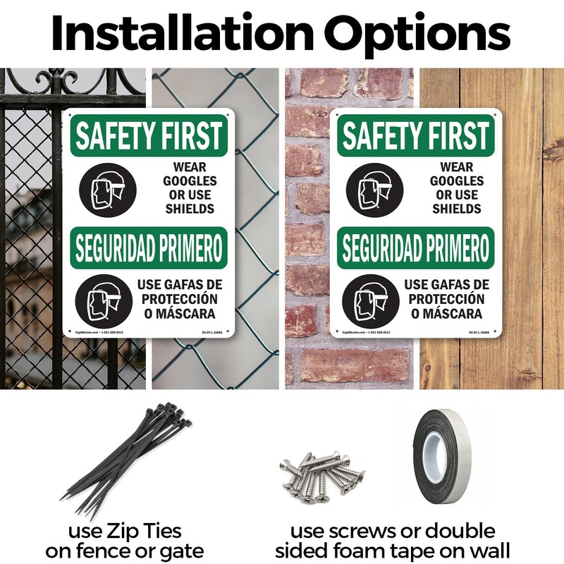 Wear Goggles Face Shield Bilingual OSHA SAFETY FIRST Rigid Plastic Sign 10 Inch x 7 Inch - 5 Pack