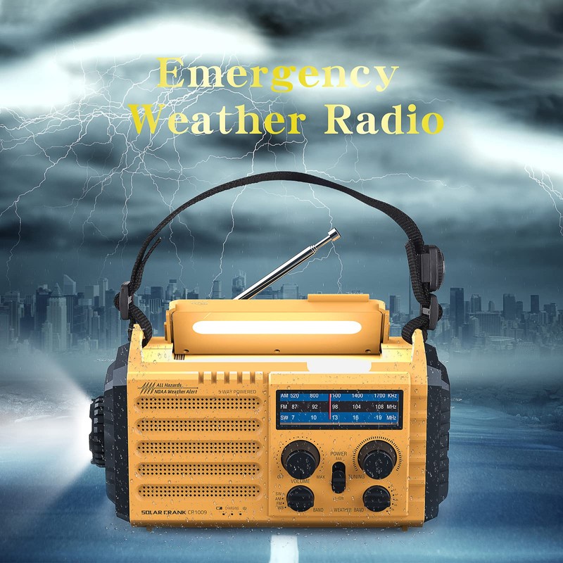 - MULTI-USE & DURABLE- The upgraded crank radios is enough to charge your cell phone or USB devices for a brief call or a text message during an emergency. And plus a 3.5mm headphone jack, allows you to enjoy radio shows without disturbing others. This weather radio with 3W integrated flashlights and 2.5W reading lamp are handy during emergency power cuts to see any signal in the dark. can be a lifesaver during dangerous disasters like tornadoes and hurricanes.