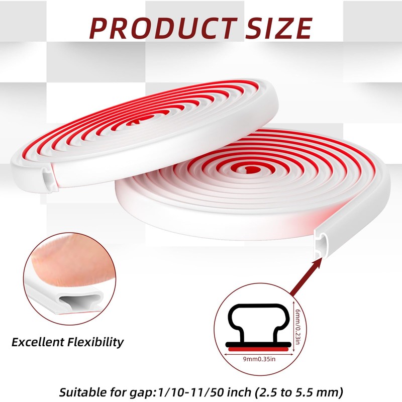 - 【PACKAGE INCLUDES】Total length 10M/12M/15M/18M, Width: 0.35inch/(7/20inch)/9mm; Thickness: 0.23inch/(23/100inch)/6mm; Suitable for gaps and gaps of 1/10 to 11/50 inches (2.5 to 5.5 mm),have two colors to choose from, they are white and black.