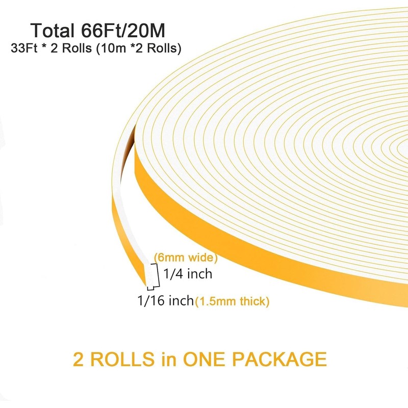 - 2 ROLLS VALUE PACK - This package includes 2 rolls of 1/4 in x 1/16 in x 33 ft foam tape, total 66 ft length. The two rolls are packed together in one package. The weather strip is easy enough to customize and cut to size with scissors or blade, and bend easily and conform to any shape