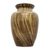 The Weathered Woody brass urn features a design that gives the urn a wood appearance. This urn has a flat top lid which also has the design. It is made of 100% aluminum and come with a threaded, airtight screw on lid to ensure contents remain securely in place. Special finishing process is done in the USA.