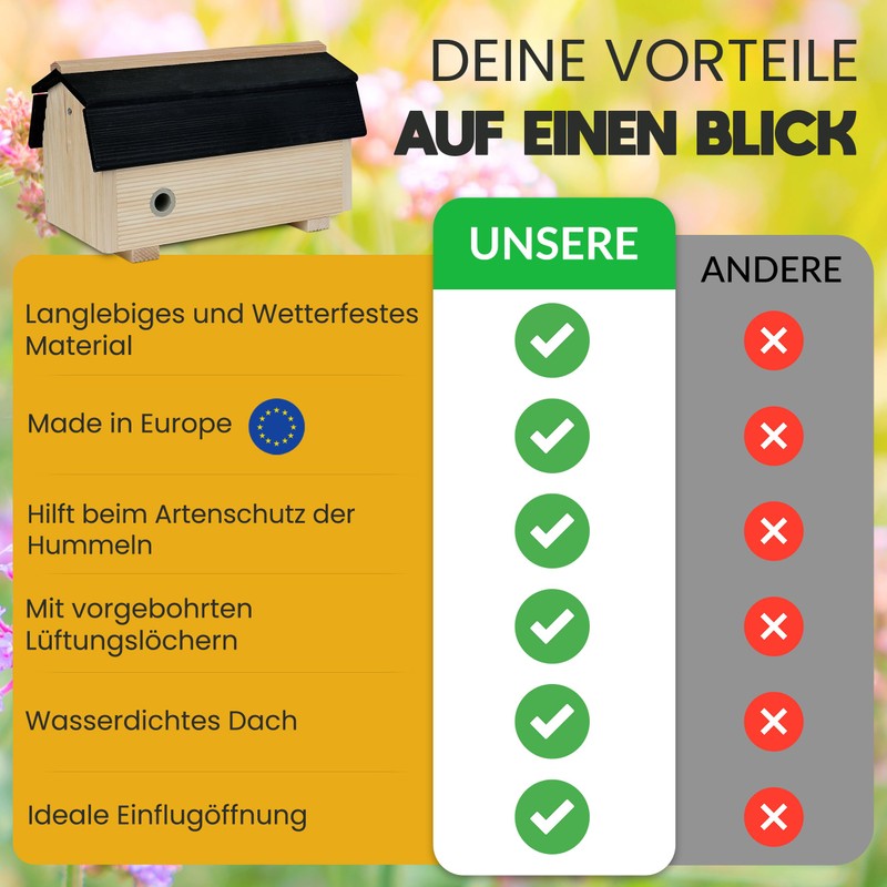 - Durable and weatherproof (alder and pine wood: made of alder and pine wood, our bumblebee house offers a solid and robust structure. The waterproof roof protects against rain and moisture, ensures a dry and cosy indoor environment for bumblebees and lasts for many seasons.