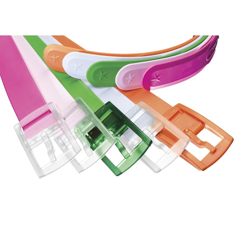 - The belt is made out of TPE (Thermoplastic elastomer) and the buckle is made out of PC (Poly Carbonate).