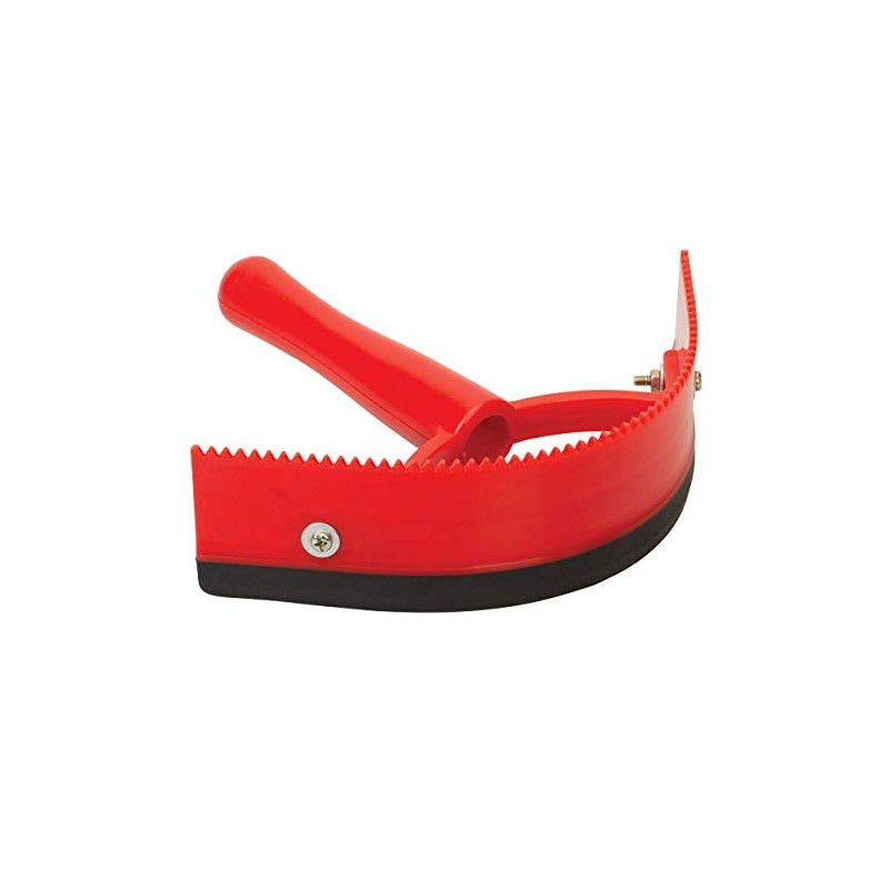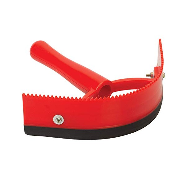 - Two tools in one with a curved rubber blade on one side and coarse curry teeth on the other