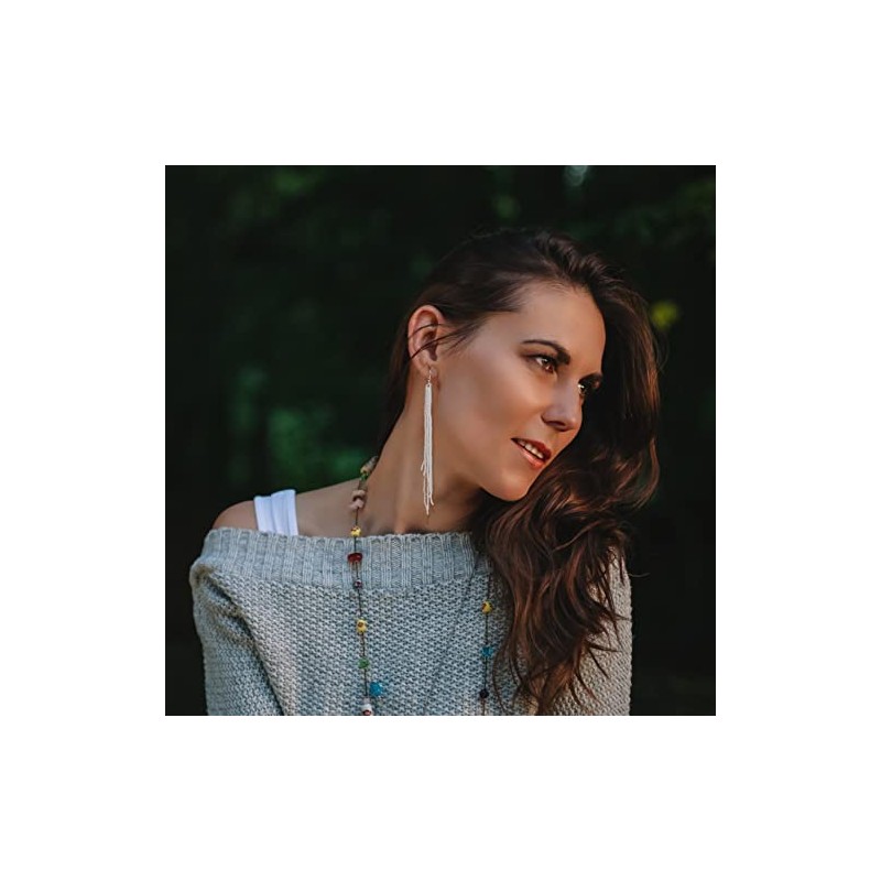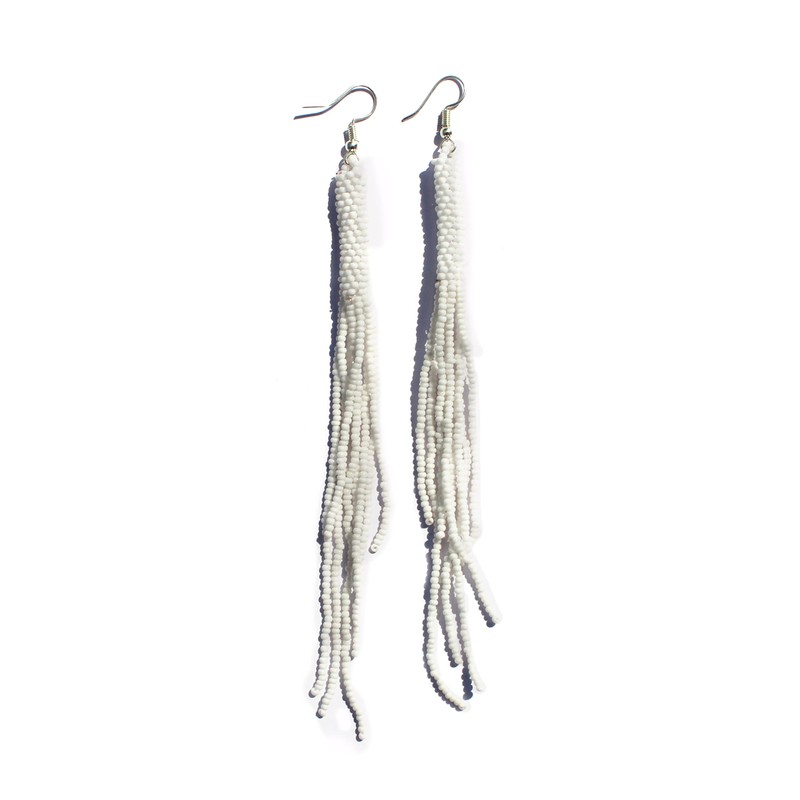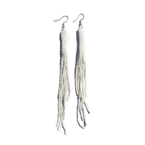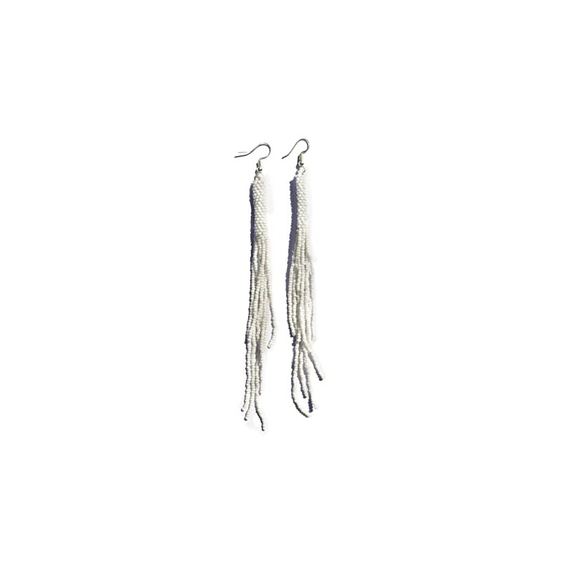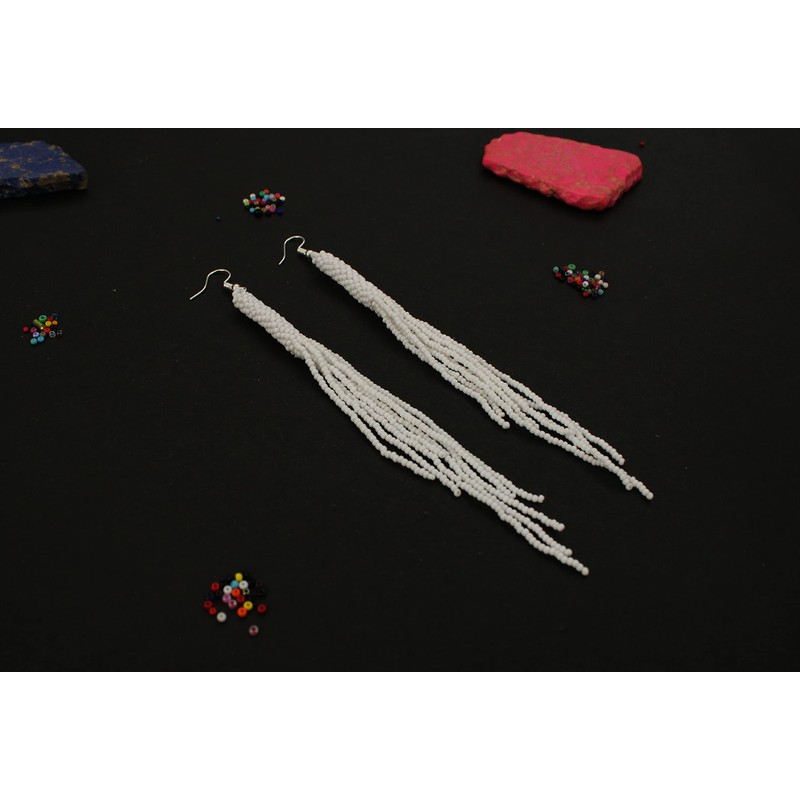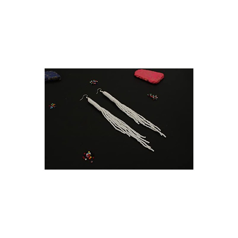 Weavish Long Beaded Dangle Earrings – Boho Native Handmade Seed Bead Tassel Bohemian Large Statement Drop Fringes for Women (White)