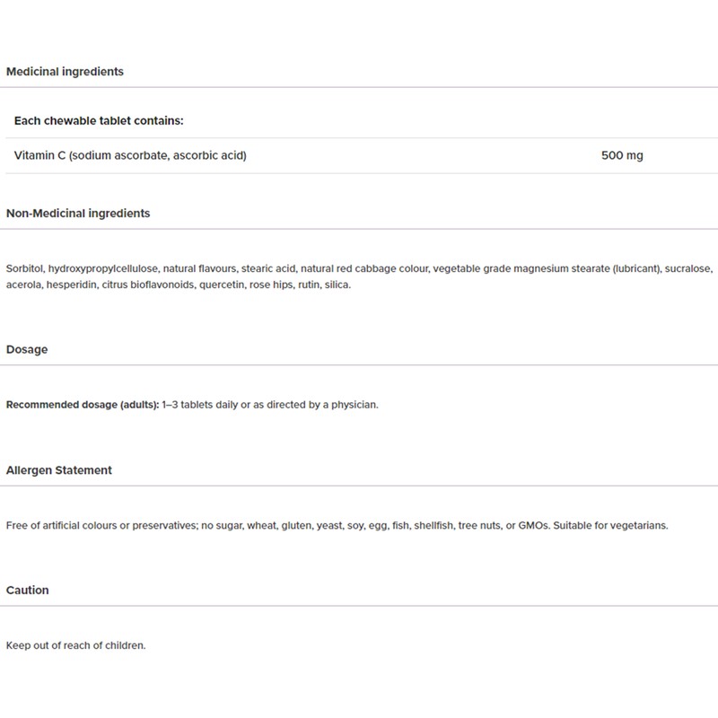 Chewable Vitamin C 500mg from Webber Naturals provides daily support for immune function, wound healing, connective tissue formation, and healthy bones, gums, and teeth. VitaminC is a water-soluble nutrient that is not stored in the body. It must be obtained daily through the diet and/or supplemental sources to support numerous aspects of human health. VitaminC is the body’s primary antioxidant, and is also able to help recycle depleted vitamin E for enhanced antioxidant protection. Vitamin C protects LDL cholesterol from oxidation and facilitates the absorption of nonheme iron to support red blood cell formation. VitaminC may also help shorten the duration of cold symptoms.