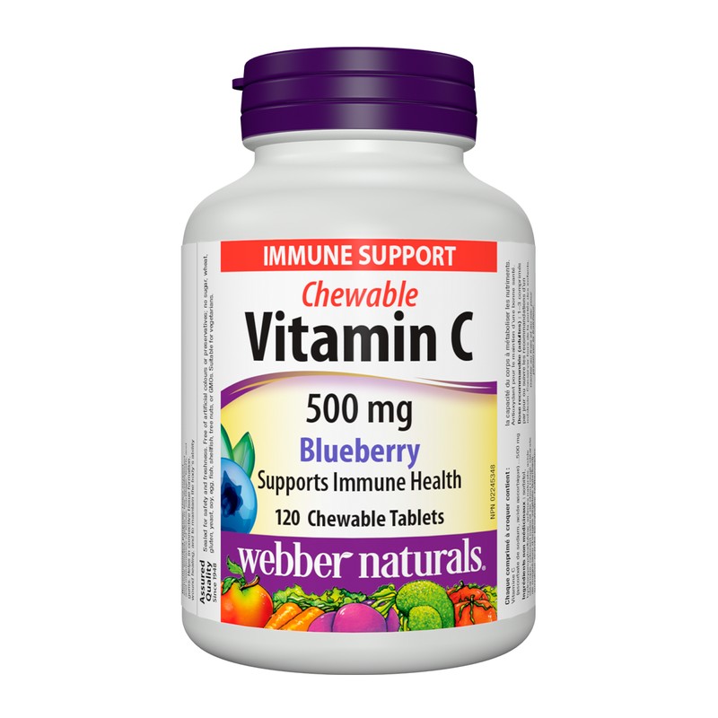 Chewable VitaminC 500mg from Webber Naturals is available in delicious natural orange, blueberry, and tropical breeze flavours. It is non-GMO, free of artificial colours and preservatives, and contains no sugar. This great-tasting chewable tablet is suitable for vegetarians and ideal for anyone who wants a convenient, great-tasting way to meet daily vitamin C needs.