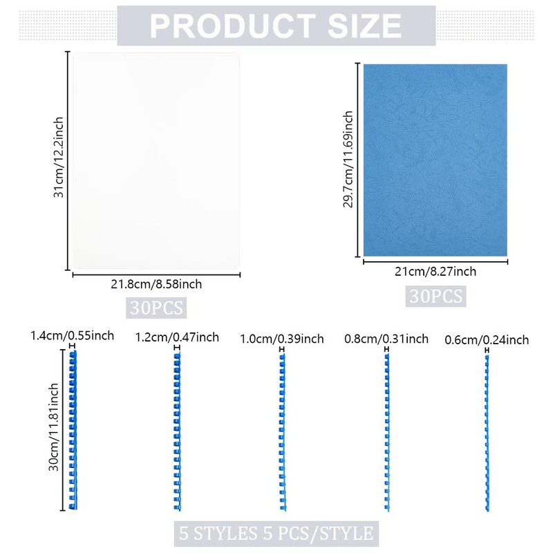 - Binding combs in various sizes: This binding set comes with 25 blue binding combs in 5 sizes: 6mm,8mm,10mm,12mm,14mm, 5 of each size.